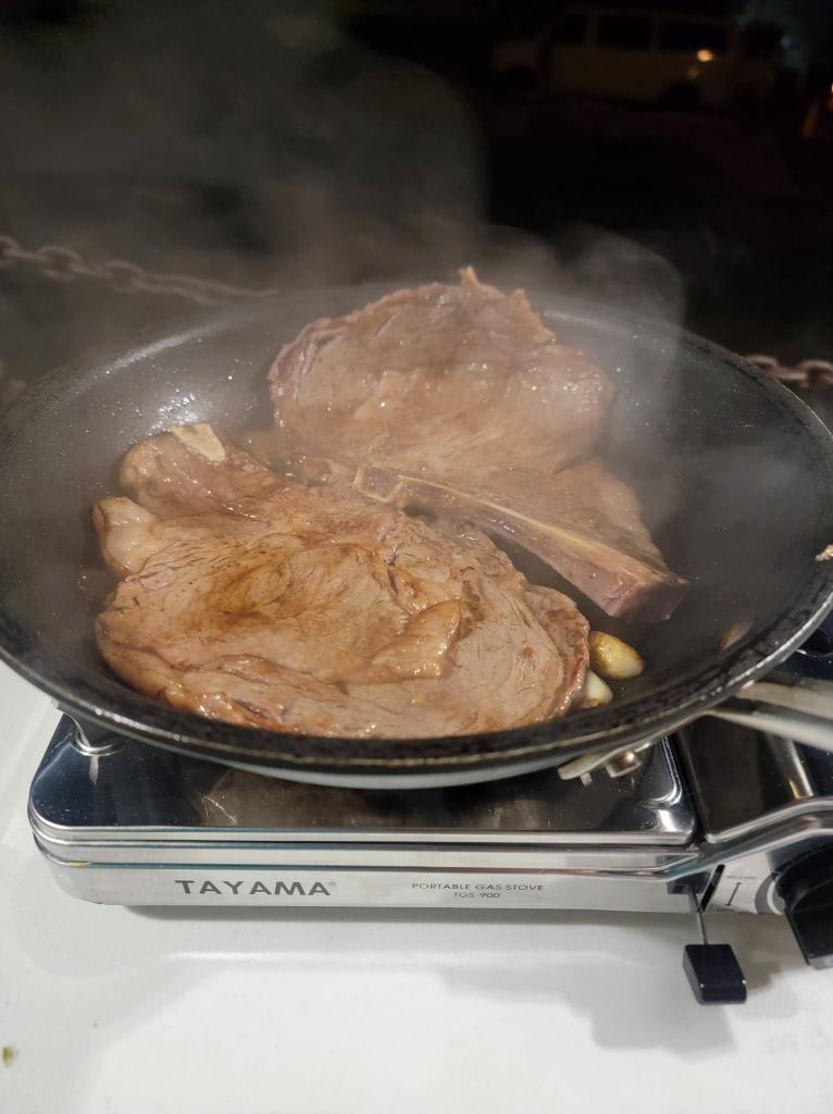 - Asparagus — tossed in garlic herb butter salt, and pepper, then charred in the same pan after the steaks rested.
