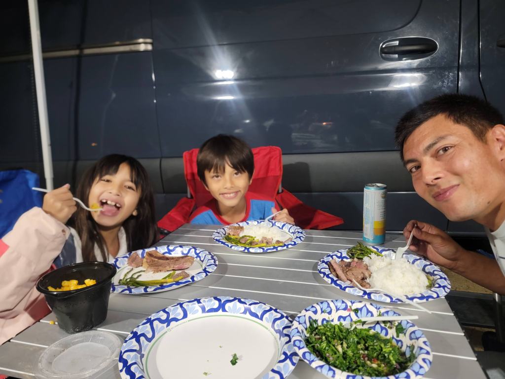 We laid everything out in paper plates (easier cleanup in the van!), dredged, pressed in the panko, and dropped it straight into a hot cast iron skillet with oil.
